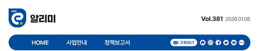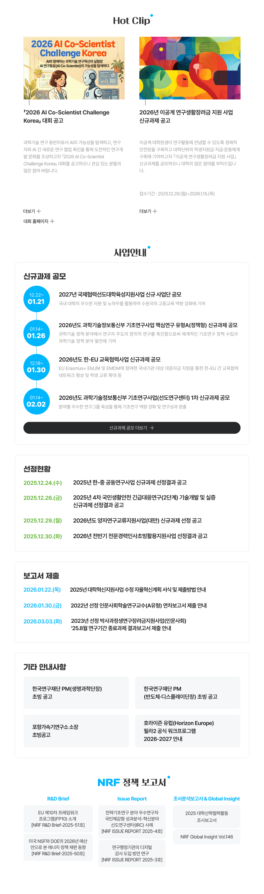 한국연구재단 e알리미 HOME 사업안내 정책보고서 구독하기 홈 인스타그램 페이스북 트위터 유튜브 블로그 「2026 AI Co-Scientist Challenge Korea」 대회 공고 - 과학기술 연구 동반자로서 AI의 가능성을 탐색하고, 연구자와 AI 간 새로운 연구 협업 촉진을 통해 도전적인 연구개발 문화를 조성하고자 「2026 AI Co-Scientist Challenge Korea」 대회를 공고하오니 관심 있는 분들의 많은 참여 바랍니다. 더보기 +  대회 홈페이지 + AI Co-Scientist Challenge Korea 대회 홈페이지 바로가기 2026년 이공계 연구생활장려금 지원 사업 신규과제 공고 - 이공계 대학원생이 연구활동에 전념할 수 있도록 경제적 안전망을 구축하고 대학단위의 학생지원금 지급·운용체계 구축에 기여하고자 「이공계 연구생활장려금 지원 사업」 신규과제를 공모하오니 대학의 많은 참여를 부탁드립니다. 접수기간 : 2025.12.29.(월)~2026.1.15.(목) 더보기 + 연결링크 2027년 국제협력선도대학육성지원사업 신규 사업단 공모 - 국내 대학의 우수한 자원 및 노하우를 활용하여 수원국의 고등교육 역량 강화에 기여 2026년도 과학기술정보통신부 기초연구사업 핵심연구 유형A(정책형) 신규과제 공모 - 과학기술 정책 분야에서 연구자 주도의 창의적 연구를 촉진함으로써 체계적인 기초연구 정책 수립과 과학기술 정책 분야 발전에 기여 2026년도 한-EU 교육협력사업 신규과제 공모 - EU Erasmus+ EMJM 및 EMDM에 참여한 국내기관 대상 대응자금 지원을 통한 한-EU 간 교육협력 네트워크 형성 및 학생 교류 확대 등 2026년도 과학기술정보통신부 기초연구사업(선도연구센터) 1차 신규과제 공모 - 분야별 우수한 연구그룹 육성을 통해 기초연구 역량 강화 및 연구성과 창출 신규과제 공모 더보기 2025년 한-중 공동연구사업 신규과제 선정결과 공고 2025년 4차 국민생활안전 긴급대응연구(2단계) 기술개발 및 실증 신규과제 선정결과 공고 2026년도 양자연구교류지원사업(대만) 신규과제 선정 공고 2026년 전반기 전문경력인사초빙활용지원사업 선정결과 공고 사회과학연구(SSK)지원사업 연차보고서 제출 안내 2025년 대학혁신지원사업 수정 자율혁신계획 서식 및 제출방법 안내 2022년 선정 인문사회학술연구교수(A유형) 연차보고서 제출 안내 2023년 선정 박사과정생연구장려금지원사업(인문사회) ’25.8월 연구기간 종료과제 결과보고서 제출 안내 한국연구재단 PM(생명과학단장) 초빙 공고 한국연구재단 PM(반도체·디스플레이단장) 초빙 공고 포항가속기연구소 소장 초빙공고 호라이즌 유럽(Horizon Europe) 필라2 공식 워크프로그램 2026-2027 안내 EU 제10차 프레임워크 프로그램(FP10) 소개 [NRF R&D Brief-2025-51호] 연결링크 미국 NSF와 DOE의 2026년 예산안으로 본 에너지 정책 재편 동향 [NRF R&D Brief-2025-50호] 연결링크 전략기초연구 분야 우수연구자 국민체감형 성과분석-혁신분야 선도연구센터(IRC) 사례 [NRF ISSUE REPORT 2025-4호] 연구행정기관의 디지털 감사 도입 방안 연구 [NRF ISSUE REPORT 2025-3호] 2025 대학산학협력활동 조사보고서 연결링크 NRF Global Insight Vol.146 파일 다운로드 연구윤리정보포털 포토뉴스 기획마루 기초공감 성과카드뉴스 수신거부